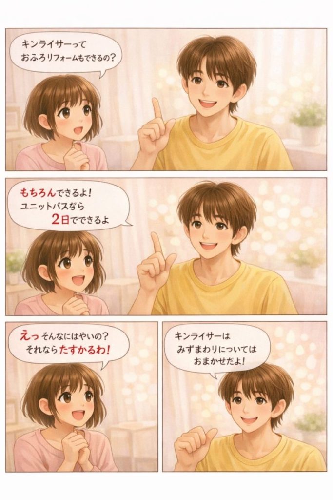 この記事では、 キンライサーのお風呂リフォームが“どこまでできるのか” そして “どこまでが専門外なのか” を、やかんくんの回答も交えながら、わかりやすくまとめました。